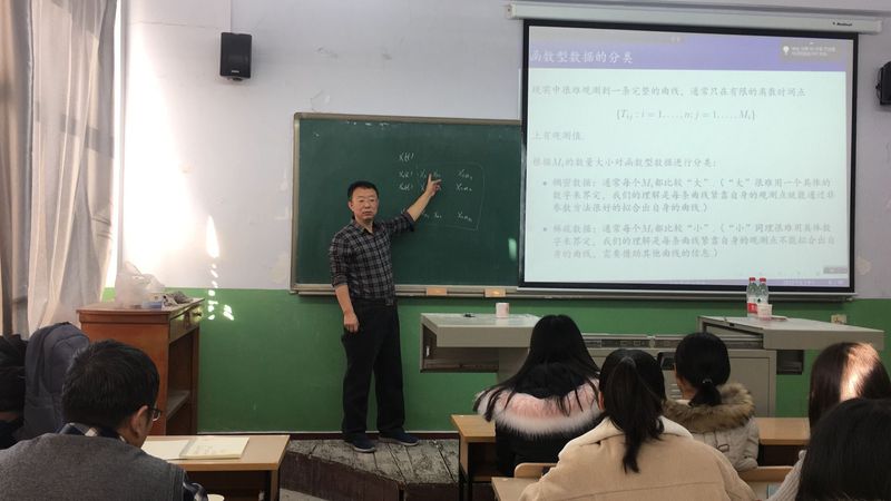 报告会中,张日权教授结合他多年的学习,教学和研究经验,向同学们介绍了函数型数据的概念。其中,张日权老师通过举心电图例子引入一维数据,又分别举例介绍二维及多维的概念。现实中很难观测到一条完整的曲线,只观测到的是集散的点。面板数据,纵向数据是函数型数据的特殊情况。函数型数据分成稠密数据和稀疏数据,并举出男女孩身高增长图作为实例。首先,对函数型数据分情况进行估计,并运用主成分方法对无限维进行降维成有限维,得出函数型主成分得分。接下来,张老师又对函数型数据进行回归模型的估计,分成四大类进行讲解,并对模型进行检验。最后,萝莉社