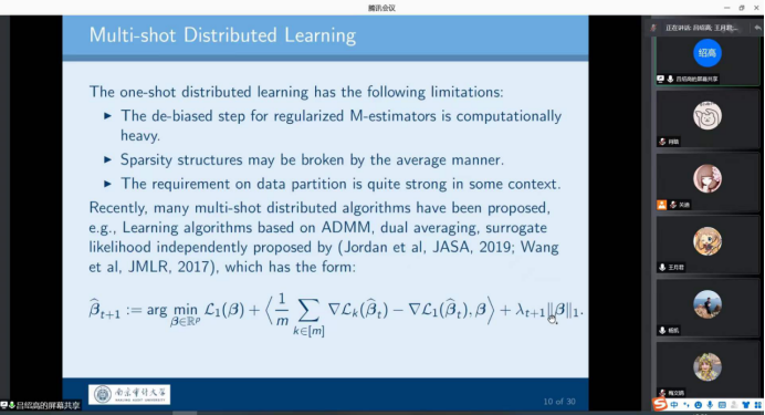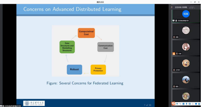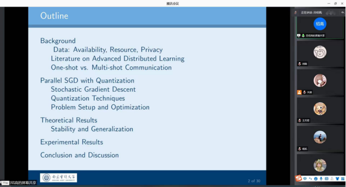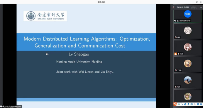 报告会中,吕绍高老师分别从理论背景,带有量化的分布式SGD的原理以及模拟实验等几个方面讲述了对广泛使用的带有量化的分布式SGD的一些关键因素之间的相互作用,包括量化水平、优化误差和泛化性能,为师生们做了一场精彩的学术报告。理论结果表明,对于凸目标,在通信效率、优化误差和泛化性能之间存在着一些权衡,对于非凸目标,其量化水平对概括能力有更大的影响。在非凸的情况下,得出的泛化界限也表明,即使SGD的步长非常小,也可能需要早期停止来保证一定的泛化精度。最后,吕绍高老师介绍了使用逻辑模型和神经网络进行了几个数值实验,以支持理论结论。