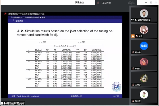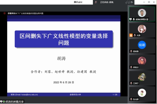 报告会上,胡涛教授首先介绍了生存分析数据的应用背景,通过尼日利亚儿童死亡率案例详细阐述了区间删失下广义线性模型的变量选择方法、理论、算法及应用,最后介绍了此领域相关重要文献和有待进一步深入研究的问题。