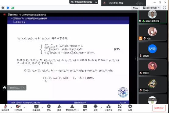 胡涛教授的报告内容丰富、幽默风趣、深入浅出,给参会师生留下了非常深刻的印象。报告会结束后,胡教授同大家进行了热烈的讨论和交流。此次报告拓展了师生的学术视野,对进一步提高我院统计学学科的科研水平具有启发式的意义。