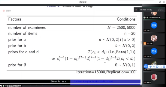 在报告中,付志慧教授详细介绍了针对多维4PL模型提出的基于数据扩充的Gibbs抽样法,该算法简单高效。除了上、下渐近线参数以外,其余参数的满条件分布都是相应参数先验分布的截断,因此,不需要考虑先验分布的共轭性。最后,通过模拟研究将所提方法与R包“MIRT”及“OpenBugs”的估计结果进行了分析比较,并使用4PL模型分析了一个经验数据集,模型选择指标显示4PL模型要优于3PL和2PL模型。