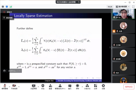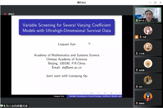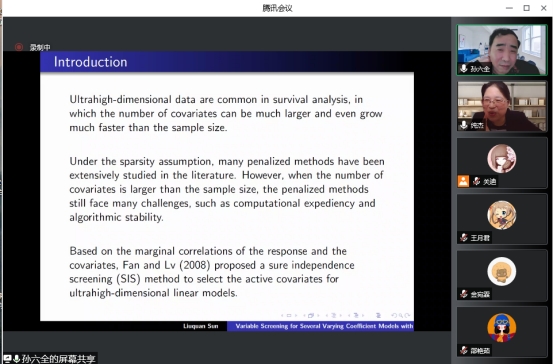 本次报告会的主题是“基于超高维生存数据的变系数模型的变量筛选”,报告会伊始,孙六全老师针对变系数加性风险模型,提出了一种有效的剔除不重要变量和识别重要变量零子区域的方法。在此基础上,孙老师阐述了一种基于核平滑和分组学习的变系数Cox模型非边缘变量筛选方法。最后,针对单指数形式的变系数灾害模型,提出了一种生存型条件相关方法并讲解了真实的数据例子。