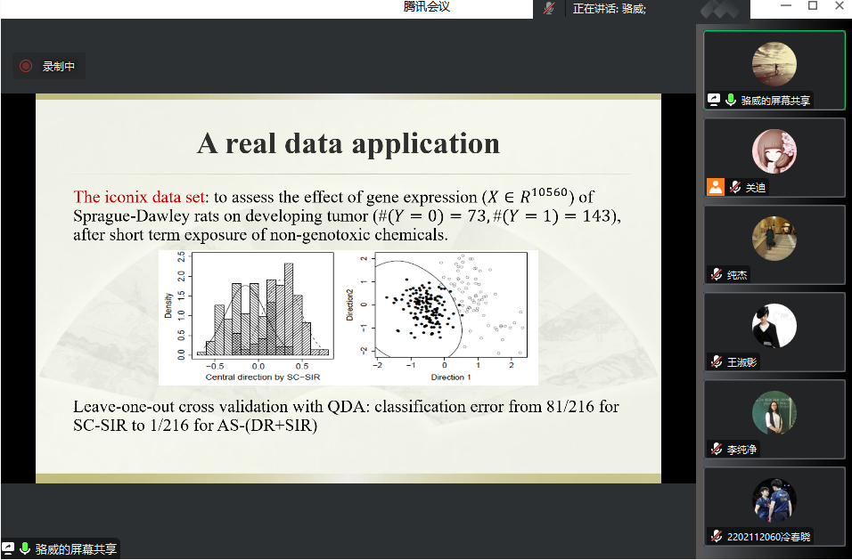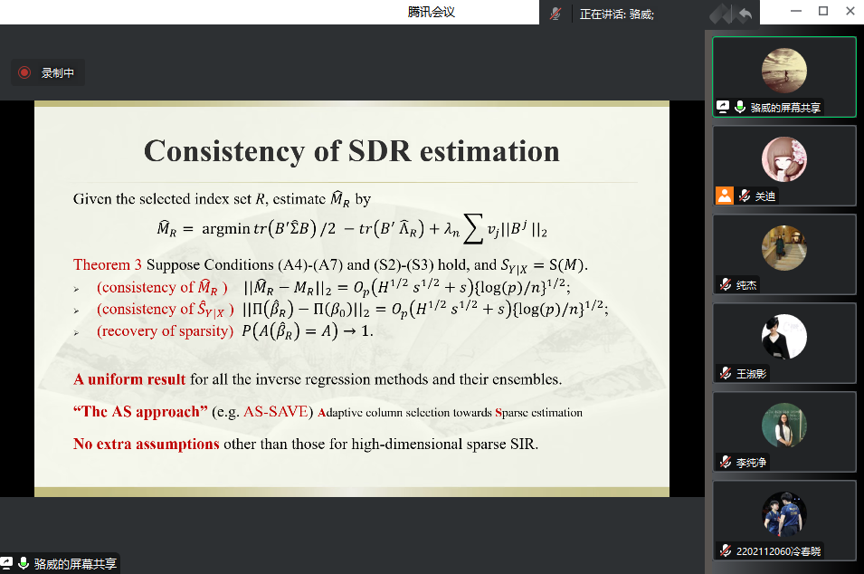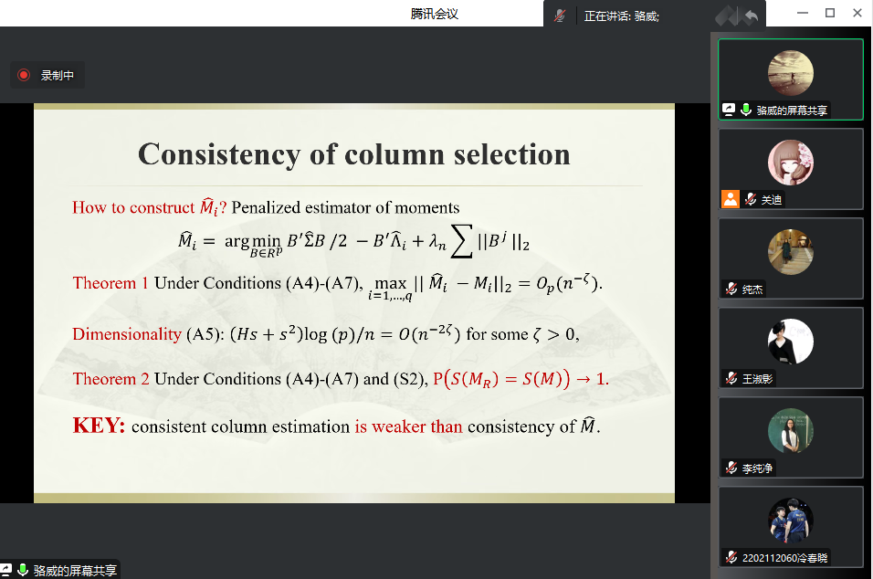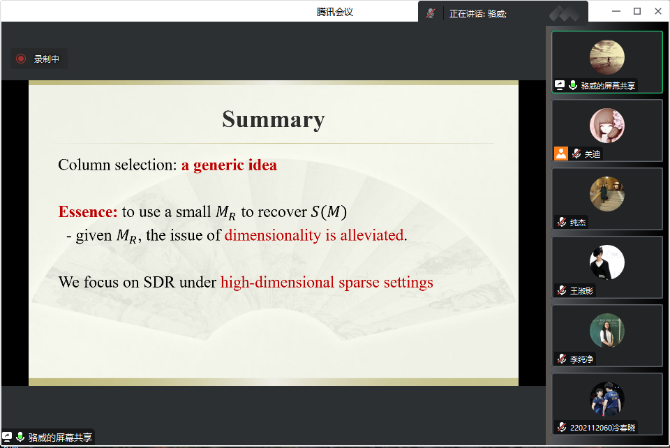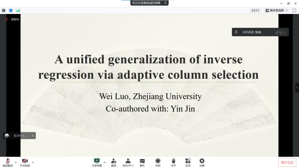 主办的报告——“A unified generalization of inverseregression via adaptive column selection”在腾讯会议线上举行,特别邀请骆威老师作为主讲人,基于骆威老师本人的研究以及工作经历,为萝莉社