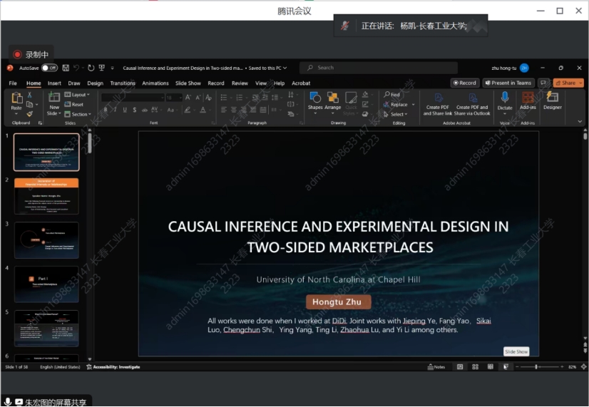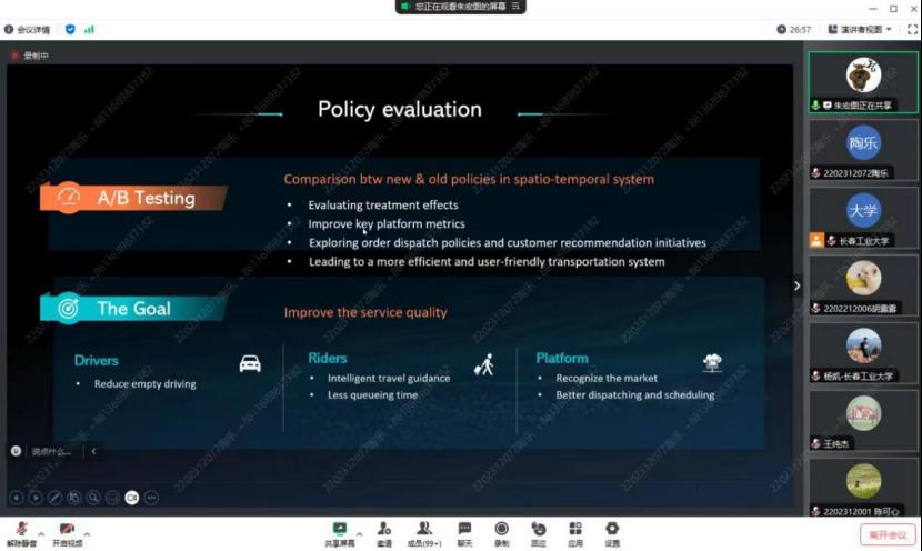 在报告中,朱教授从现代科技公司入手,如谷歌、优步和滴滴,对分析平台政策和感兴趣的结果之间的因果关系进行了阐述,朱教授提出了VCDP模型来描述动态的治疗效果。进而在基于OPE方法的估计程序下提出了三个动态环境下序贯治疗的最佳分配策略,此策略会有效减少治疗效果估计的方差。通过朱教授的讲解同学们了解到研究结果要根据大量的模拟和真实的数据得出,同学们纷纷表示在今后的学习生活中要脚踏实地。