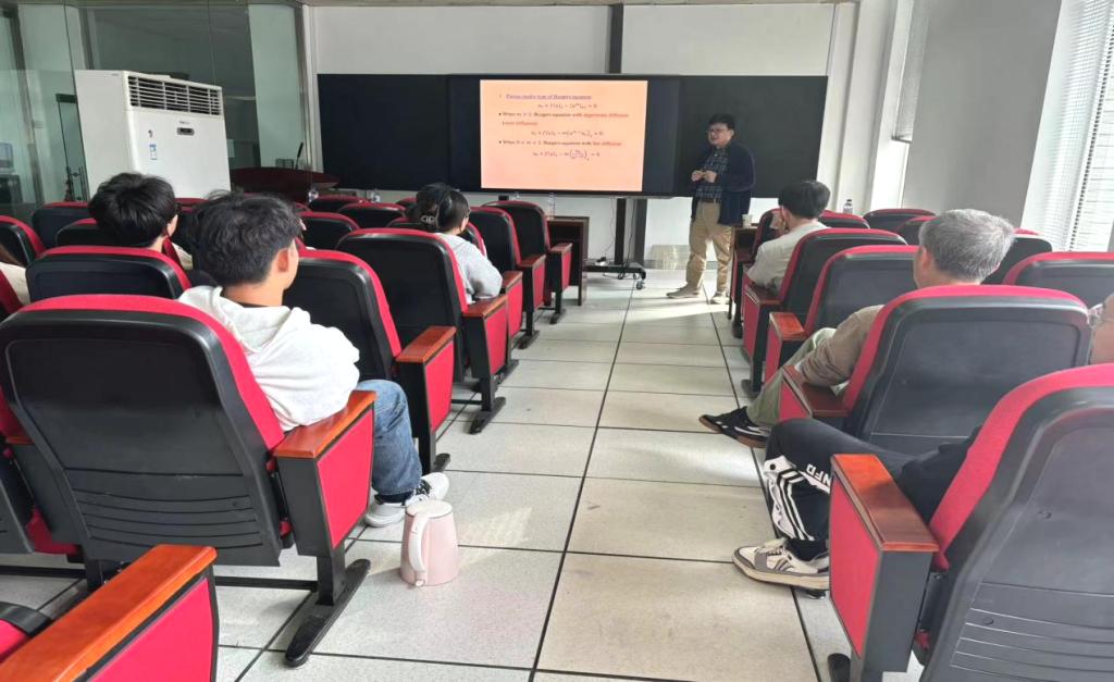 在报告中,梅茗教授首先向同学们介绍了一种重要的非线性偏微分方程,即Burgers方程,它在物理学、流体力学以及数学等多个领域中均有着广泛的应用。随后,梅茗教授详细地讲解了带有快扩散和奇性的Burgers方程粘性激波的稳定性。在常数状态u+=0时,该方程由于多孔介质中的快速扩散特性,展现出了强烈的奇性。针对这一难题,梅茗教授技巧性地选取了与粘性激波相关的加权函数,利用加权能量技术有效地克服了Burgers方程的奇性。最后,梅茗教授解释了这一方法的原理和应用过程,让在场师生深受启发。
