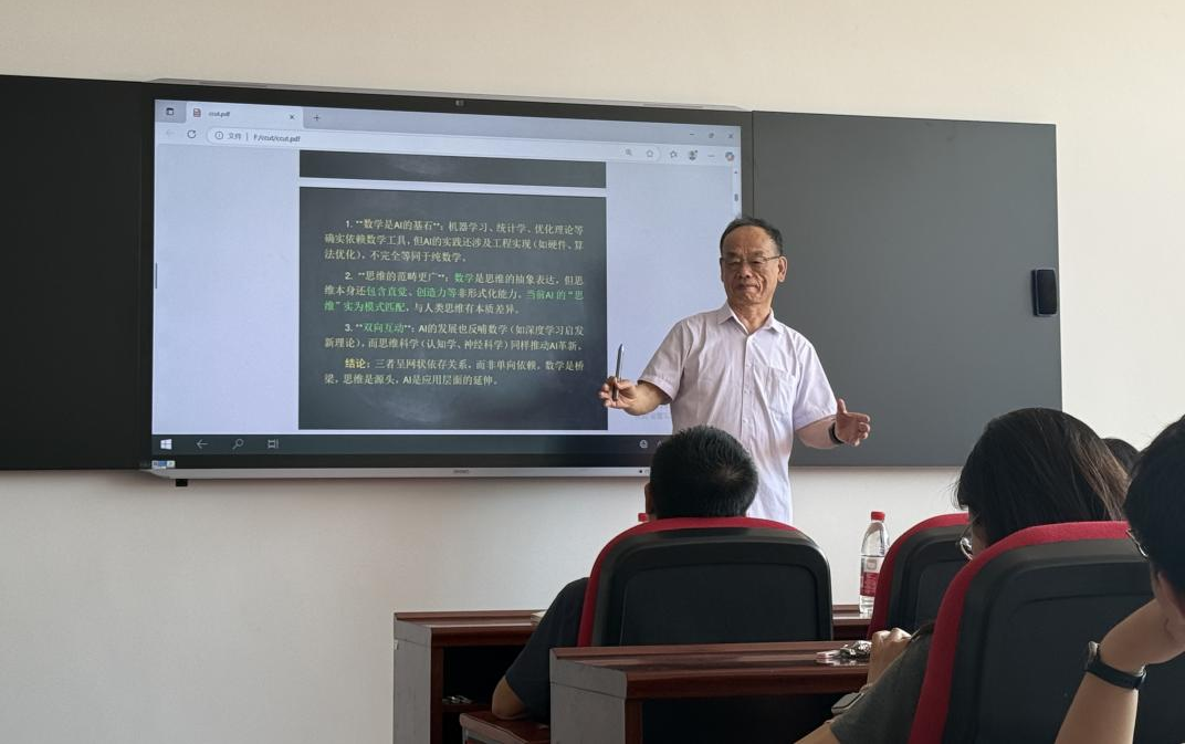 会后,尹老师同大家展开了热烈的讨论,尹老师对于大家提出的与该报告会相关的方法问题做出了专业的解答和建议。本次报告不仅拓宽了听众对人工智能与数学结合的认识,更启发了我们对数学本质的思考。它让我们认识到,在技术迅速发展的今天,数学教育应更加注重培养学生的逻辑思维与创新能力,而非仅仅依赖工具。同时,报告也激励数学研究者深入探索基础理论,在人工智能时代持续发挥数学的基石作用。