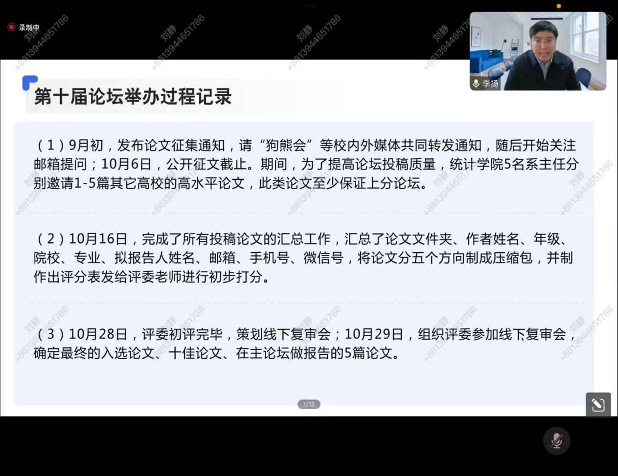 报告题目:本次学术报告由中国人民大学统计学院李扬教授主讲,主题为“全国高校研究生统计论坛组织经验分享”。