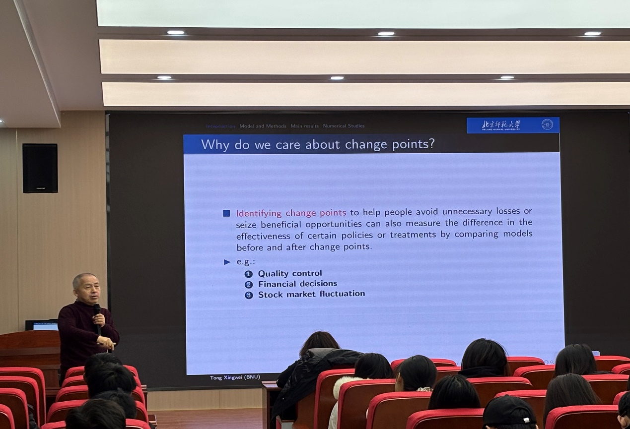 童教授先是分享了读书的经验、工作的经历以及自己所创的工作。同学们认真聆听,受益匪浅。紧接着,童教授以举例子的方式切入本次报告的主题——随机变点。在修路的过程中会遇到山川、河流、土坑等等一系列不确定的因素,为了使修路的资金最小化,就需要在这些不确定因素下进行不同的处理。这就是随机变点的概念。