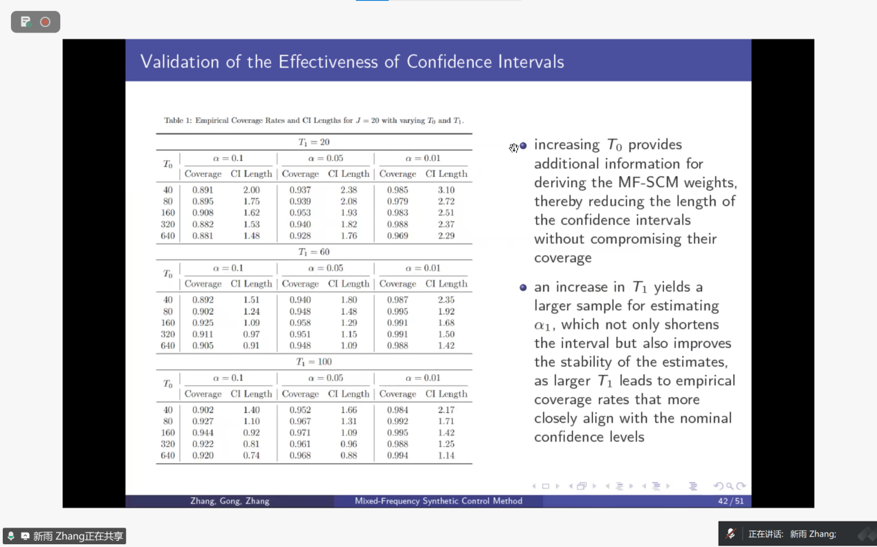 报告伊始,张教授介绍了传统合成控制法(SC)在政策因果效应评估中的基础作用,同时指出其在混合频率数据(如季度与月度数据并存)场景下的局限性——以2017年美国税改等案例为例,传统方法因数据频率不匹配易失效。张教授及团队提出的MF-SCM方法,通过分布滞后模型、潜变量框架等技术对齐不同频率数据(如将低频结果视为高频潜变量的加权聚合),再通过最优权重组合控制单元,构建处理组的反事实结果以估算政策效应。该方法还包含渐近最优性、分布理论等理论支撑,以及模拟与真实数据验证环节,为混合频率场景下的政策评估提供了新的分析工具。