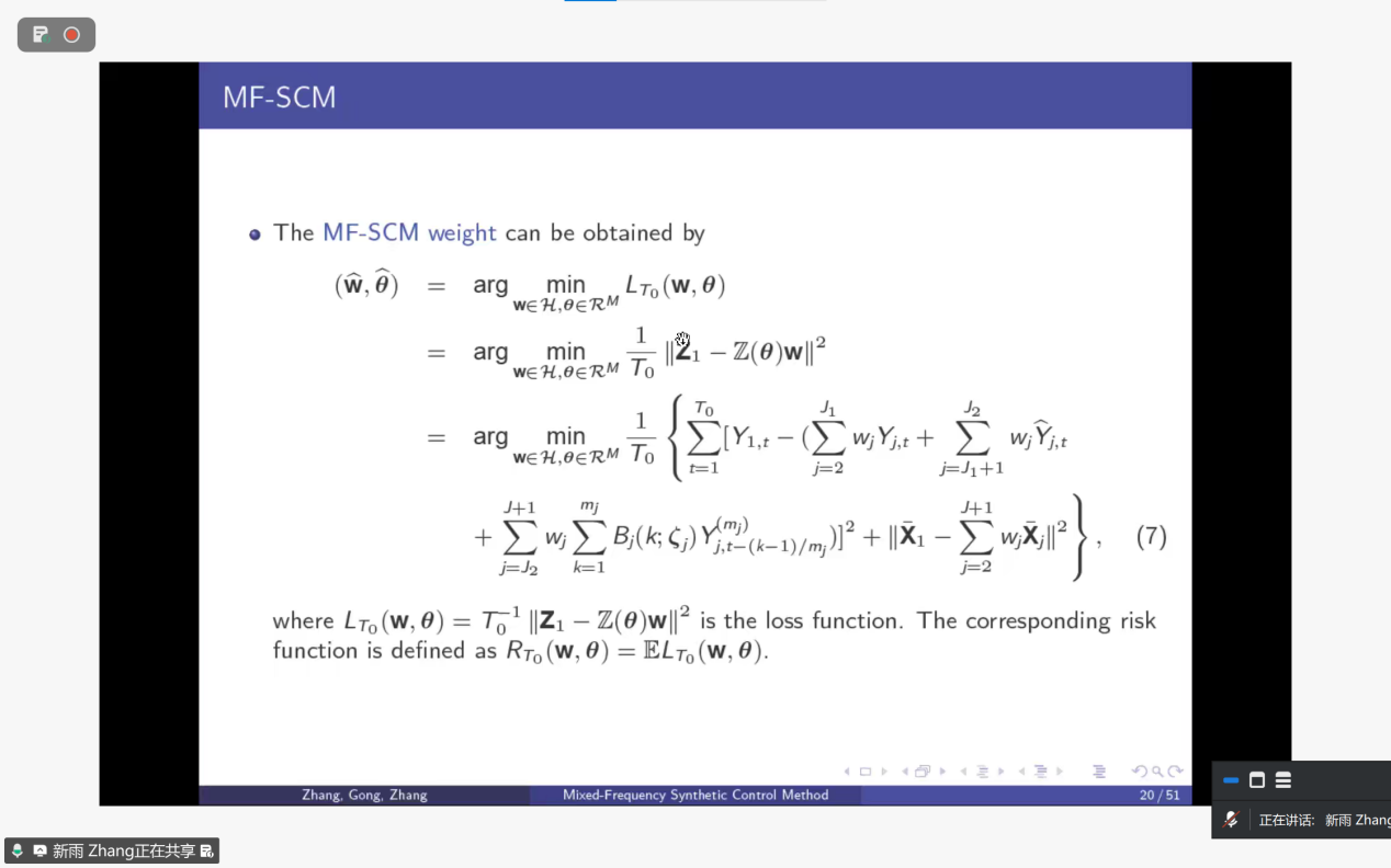 在报告中,张教授详细讲解了混合频率合成控制方法(MF-SCM),以“低频观测值 = 高频潜变量加权聚合”为核心假设,通过理论框架搭建、权重求解优化、效应估算机制三大关键技术设计,实现了不同频率数据的有机融合与高效利用,成功破解传统方法在混合频率场景下的应用难题。