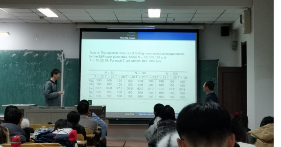 在报告中,冯副教授首先向我们细致深刻的分析了一个高维面板数据的横截面独立性测试问题,用线性回归模型描述了截面相关性。冯副教授向我们讲述了他研究的三个测试,即the sum test、the max test和the max-sum test,其中后两个是新的。报告中分别设计了线性回归中稀疏残差和非稀疏残差的最大和和检验,并设计了最大和检验来保证残差的两种情况。此外,冯副教授还建立了面板数据线性回归模型中样本相关系数极大值的渐近理论,这也是对高维数据这方面知识的首次成功尝试。最后,冯副教授进行了大量的仿真研究和案例研究。证明了冯副教授提出的方法在残差是否稀疏的情况下,经验能力和稳健性方面都具有优势。