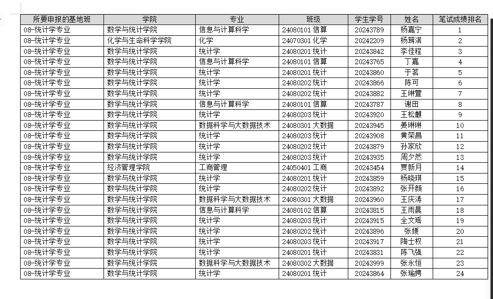 基础学科拔尖学生培养基地(统计学专业)笔试通过名单公示