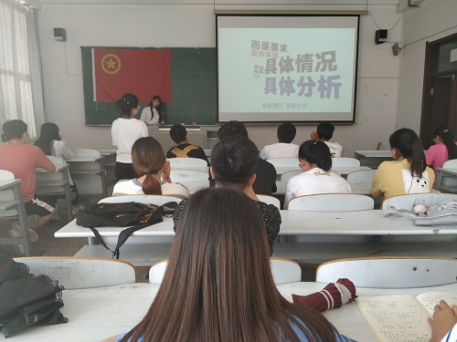 团委于2019年6月29日在教图楼309教室开展“学习筑梦”系列活动之“推进马克思主义中国化时代化大众化”主题学习会,本次会议由宣传部副部长刘芙蓉主持,2017、2018级主要学生干部参加了此次学习。