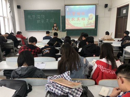 在团课的开始,团支书向同学们提出了“何为英雄”的问题,并做出回答:“英雄是一个具有爱国情怀、民族气节、必胜信念、英雄气概这四个优秀品质的人。”为了强调英雄对一个民族的重要性,各班团支书向同学们介绍了几位典型的民族英雄,他们分别是鸦片战争英雄林则徐,抗日战争英雄杨靖宇、佟麟阁、赵一曼,和平年代英雄袁隆平、焦裕禄等人。在团课的结尾,180801班团支书闫新洋总结道:“学习英雄要求我们从小树立远大志向,要求我们从小拥有拼搏的精神,要求我们从小具有勇于担当的勇气。当遇到一些人胡编乱造,故意抹黑英雄烈士时,我们作为大学生,一定要敢于站出来自觉抵制并与这种丑恶行为作斗争。”