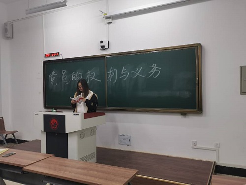 党委学生党支部以学院二级分党校为理论主阵地,在入党积极分子中积极开展对党的基础知识的学习,增强和提升积极分子们的理论思想和政治觉悟。2020年1月9日下午,学生党支部在北湖校区东区主楼120教室举办二级分党校2019-2020学年第四期党课培训班,第二讲,党员的权利与义务。本次培训由预备党员虎佳尧与宋思晗主讲,2018级入党积极分子参加本次学习。